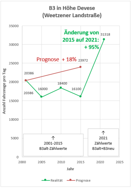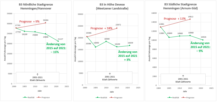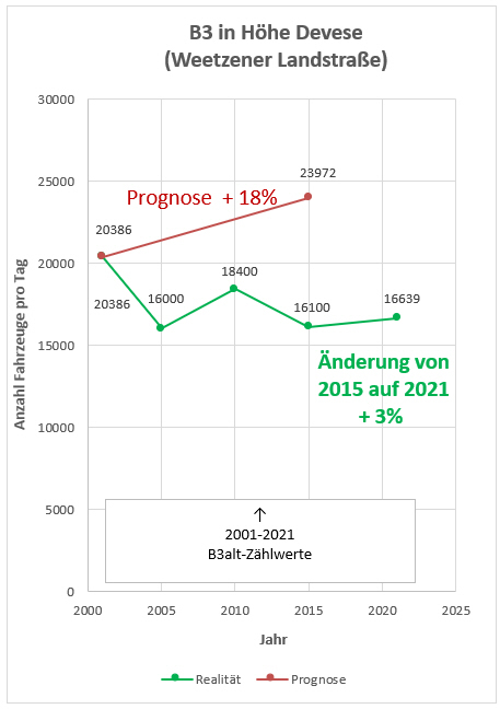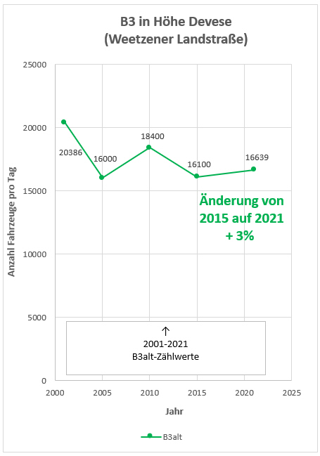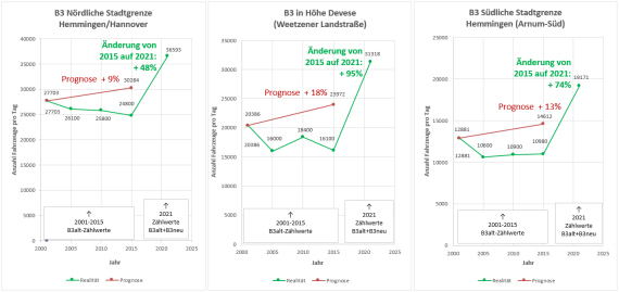 Anhand der amtlichen Verkehrszählungen der Bundesanstalt für Straßenwesen, die für alle Bürger zugänglich sind, kann man jetzt feststellen, dass diese Prognosen fern jeder Realität liegen und der Verkehr bis zur Eröffnung der B3neu im November 2020 im Gegenteil sogar deutlich abgenommen hat.