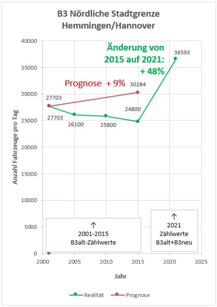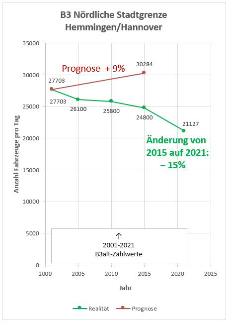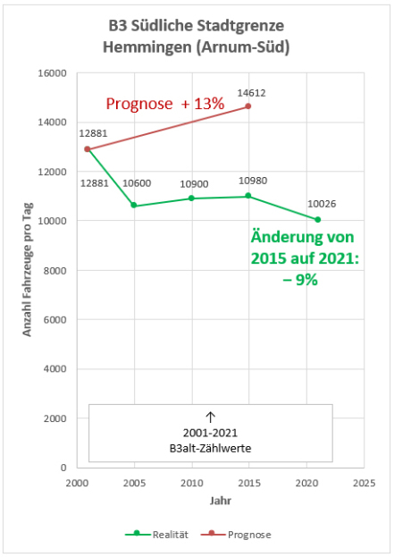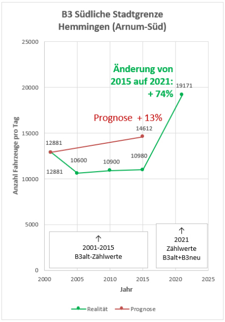 Verkehrszahlen mit der Summe der B3alt- und der B3neu-Werte ab 2021, denn seit November 2020 gibt es diese zwei weitgehend parallel verlaufenden Hauptverkehrsstraßen in Nord-Süd-Richtung in Hemmingen für den Fernverkehr. Eigentlich sollte die B3neu die B3alt entlasten. Der Gesamtanstieg kommt daher, dass die B3neu gebaut worden ist, denn „Umgehungs“-Straßen ziehen weiteren Verkehr an.