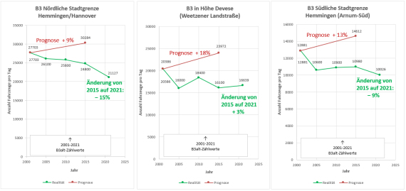 Für beide Möglichkeiten sind die amtlichen Verkehrszahlen der Bundesanstalt für Straßenwesen an der nördlichen Stadtgrenze, in der Mitte (Weetzener Landstraße) und an der südlichen Stadtgrenze dargestellt.