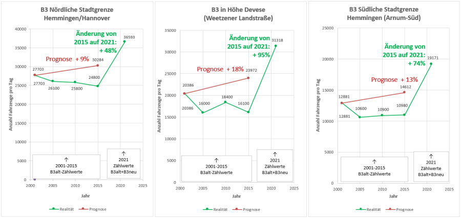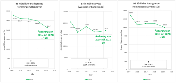 Seit der Verkehrszählung 2021 der Bundesanstalt für Straßenwesen steht fest, dass die B3alt seit November 2020 zwar geringfügig entlastet wird (durchschnittlich 8%), aber es ist eine dramatische Zunahme des gesamten Nord-Süd-Verkehrs in Hemmingen um durchschnittlich +68% zu verzeichnen (B3alt + B3neu).