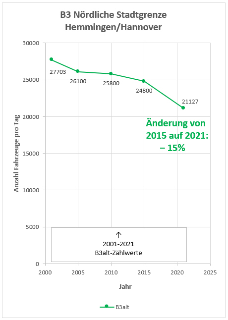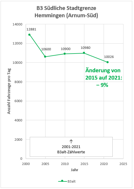 Verkehrszahlen mit der Summe der B3alt- und der B3neu-Werte ab 2021, denn seit November 2020 gibt es diese zwei weitgehend parallel verlaufenden Hauptverkehrs-straßen in Nord-Süd-Richtung in Hemmingen für den Fernverkehr. Eigentlich sollte die B3neu die B3alt entlasten. Der Gesamtanstieg kommt daher, dass die B3neu gebaut worden ist, denn „Umgehungs“-Straßen ziehen weiteren Verkehr an.